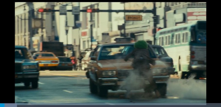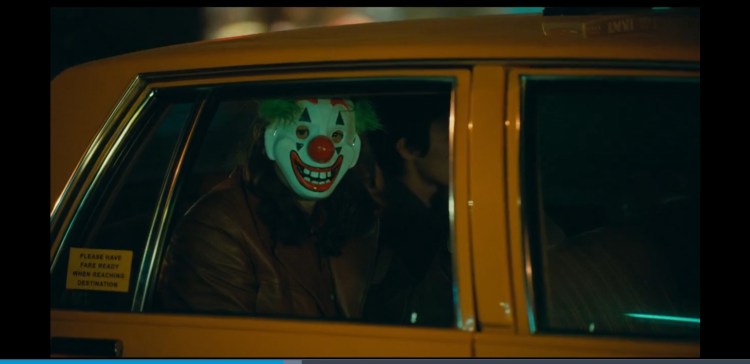 Taxis are shown as a negative influence to the narrative of this movie at 0:02:28 Arthur runs out in the road and almost gets hit by a taxi chasing the hooligans and screams.Then later on in the movie at 0:24:25 Arthur stops suddenly when crossing the road and a taxi driver drives past and he is almost hit again at 0:24:34. At 0:46:00 Arthur see’s a man wearing a clown mask in the back of a taxi and the two make eye contact. I think this is a vision and Arthur is seeing what he wants to see and the film again is showing taxi’s in a negative way as it shows Arthur is going down a dark path. Since he is happy about killing the three guys in the subway and also the clown mask the man in the taxi wears resembles Arthurs clown persona “Carnival the clown” these foreshadows later on at 1:31:55 when the tides change and its Arthur getting chased instead of Arthur chasing someone like at the beginning, he gets hit by the taxi and it doesn’t bother him as he is now no longer Arthur he is The Joker. At 1:47:51 a taxi is shown to crash at the end giving us a metaphor that The Joker is now in control and as he says on the Murray Franklin show “Nothing can hurt me anymore”