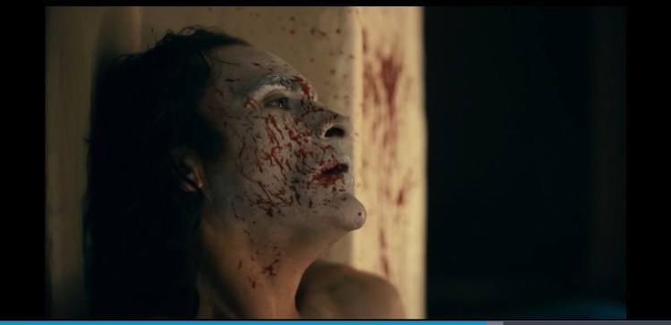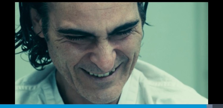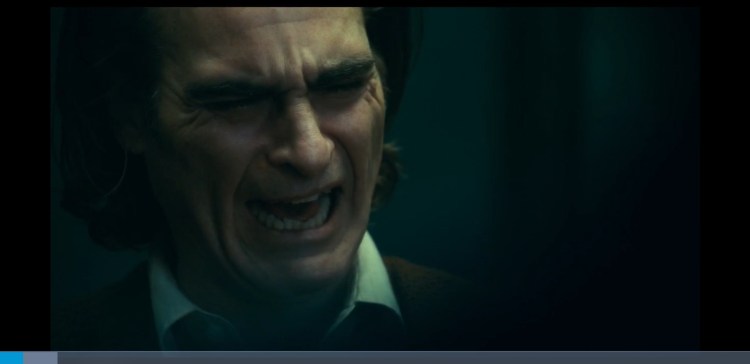 0:03:43 We cut to a shot of Arthur and he is laughing but sometimes it appears he is upset this shows us arthurs conflicting emotions fighting each other to get out and and towards the end the laughter wins “I used to think my life was a tragedy. But now i realise its a fucking comedy”. This is a quote at 1:21:08. There are more examples at 0:08:29 when Arthur begins to laugh again and it looks like he is upset again showing his conflicting emotions.. And at 0:29:05 we see the train scene and here we see multiple examples again of Arthurs emotions fighting to take over him again. He is laughing but he looks upset. And again at 1:15:10 when he finds out he is adopted. If i showed someone (who hadn’t seen this film) this image and asked what emotion arthur was feeling then they would definitely say upset. It can also be seen at 1:19:17