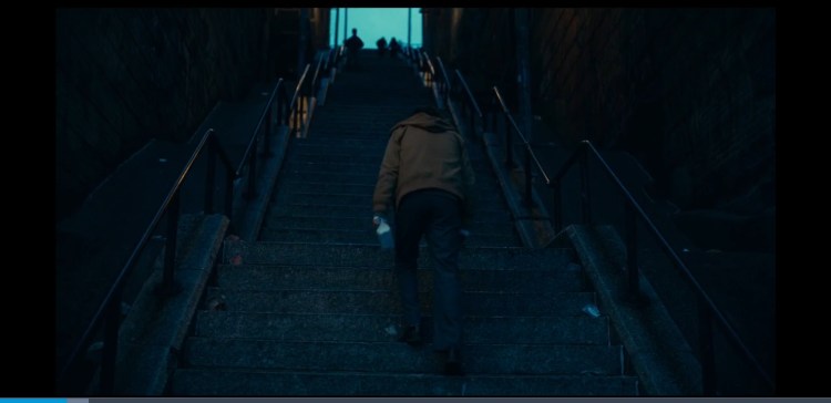 0:09:45 Arthur walks slowly up the stairs and is drained and fed up but later on in the film he walks down the stairs and is all joyful and happy with himself, but it is reversed as usually going up is reference to positive and going down is a reference to negative. This can also be seen at 0:19:18 and 0:38:06 however the flipped Staircase metaphor from 0:09:45 is used again but this time in a positive way.