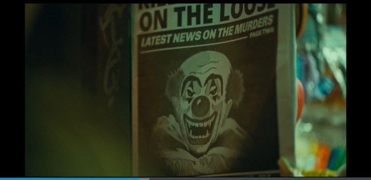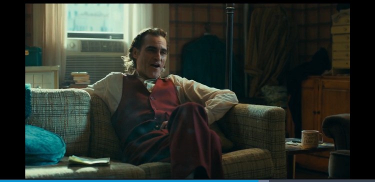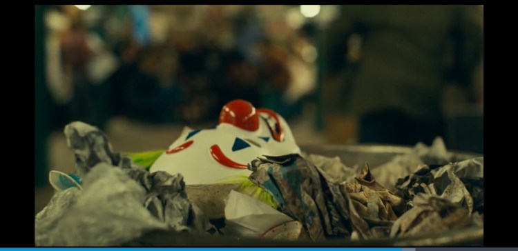 0:59:20 Attention to detail Murray Franklin mentions the garbage strike and huge pile of trash can be seen around Gotham for example around 0:18:54 when arthur is in the back alley and 0:45:00 when he is in the diner with Sophie and at 1:09:59 when Arthur visits Arkham.and when he is running from the police.